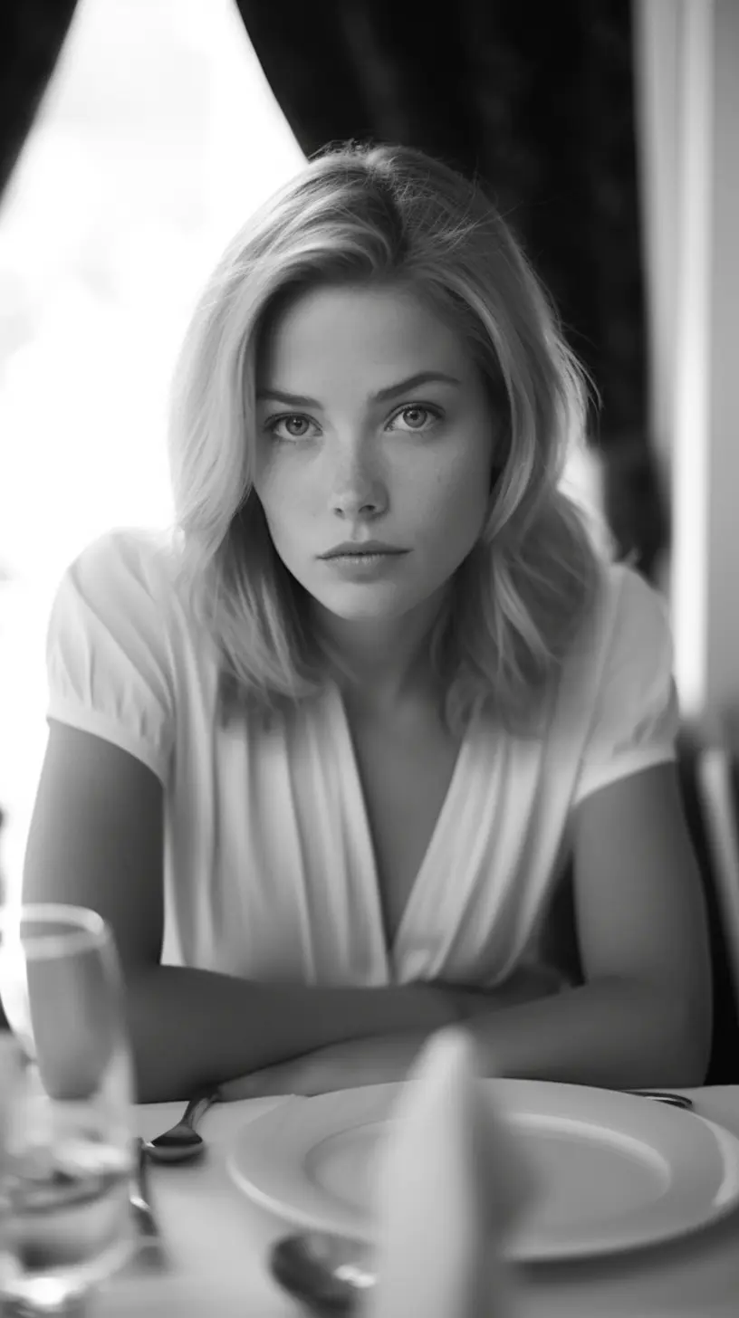 a beautiful woman sitting at a table, in the style of glamorous hollywood portraits, minolta riva mini, stark black-and-white photography, effortlessly chic, schlieren photography, classicist, candid celebrity shots