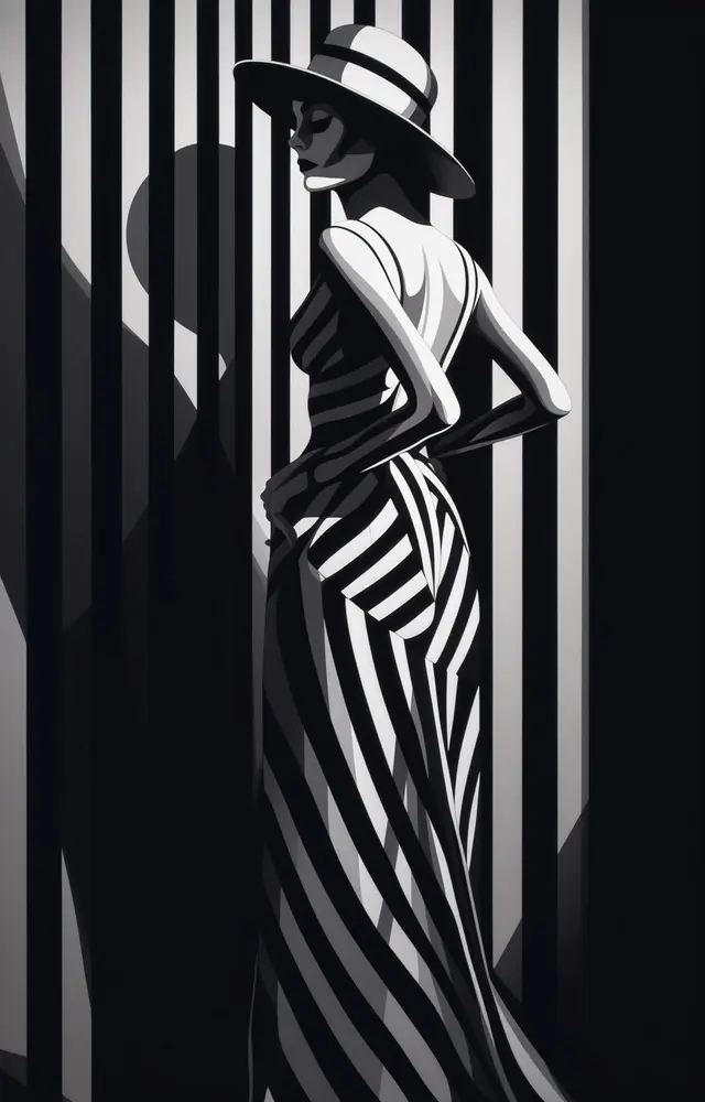 femme fatale by artist natalina svoboda at the art expo st, in the style of bold graphic lines, detailed monochrome, striped, dignified poses, paul corfield, fluid gestures
