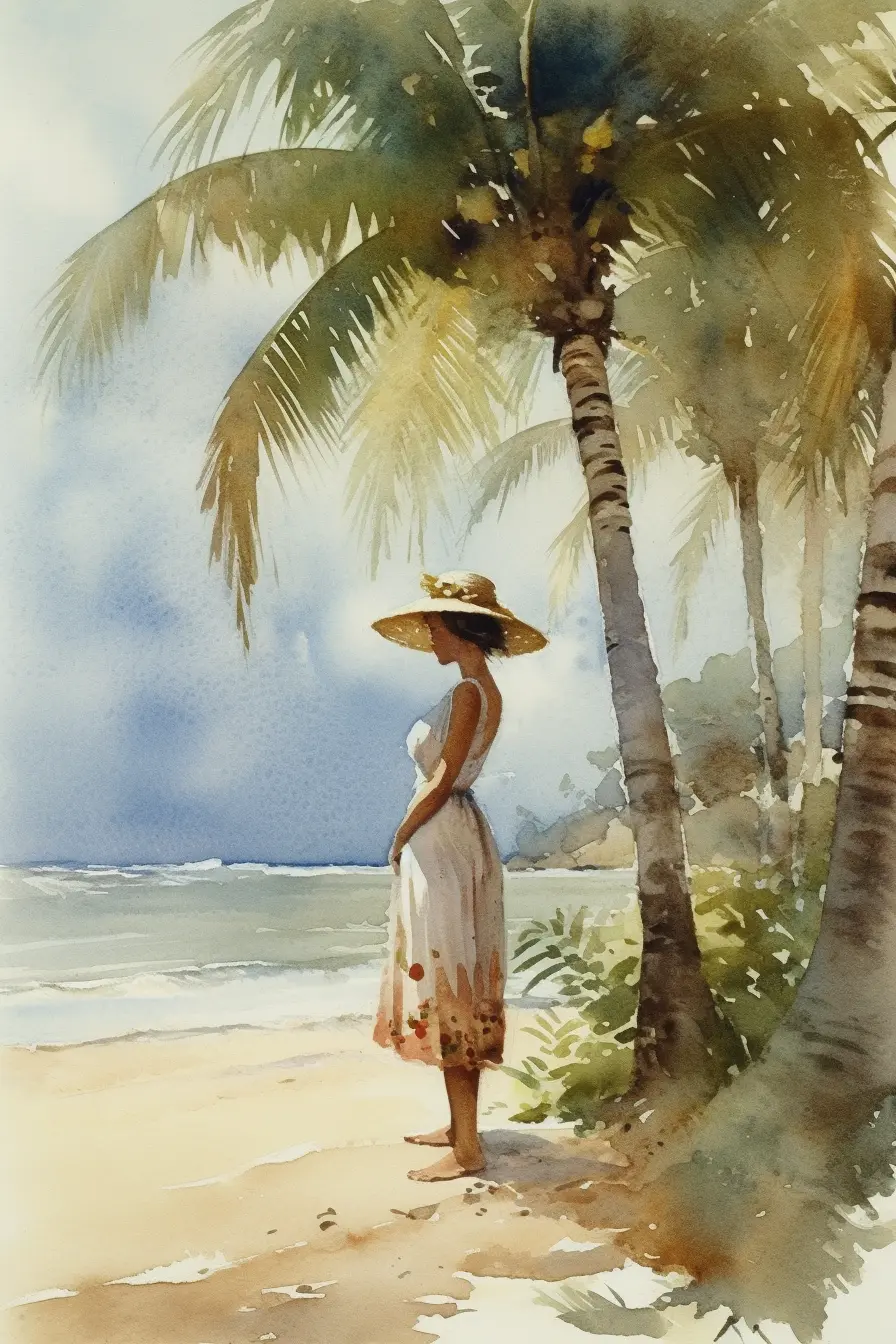 ***watercolour painting of West Indian young woman on Caribbean beach under coconut tree , no hat, no text, no logo, Monet style