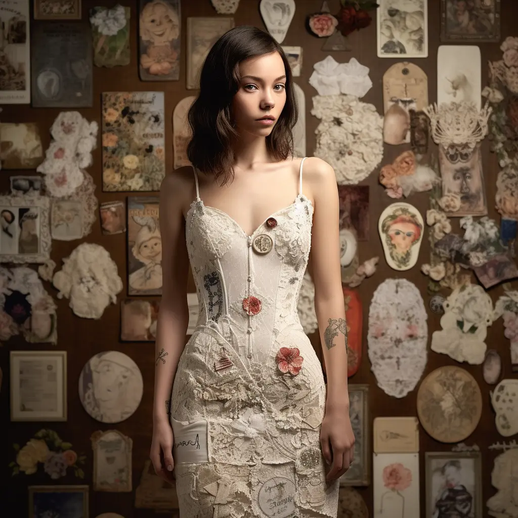 romantic fashion photoshoot, high resolution, product photography, white bustier dress covered in embroidered patches sewn and arranged on dress to resemble eclectic gallery wall, in style of VeraWang