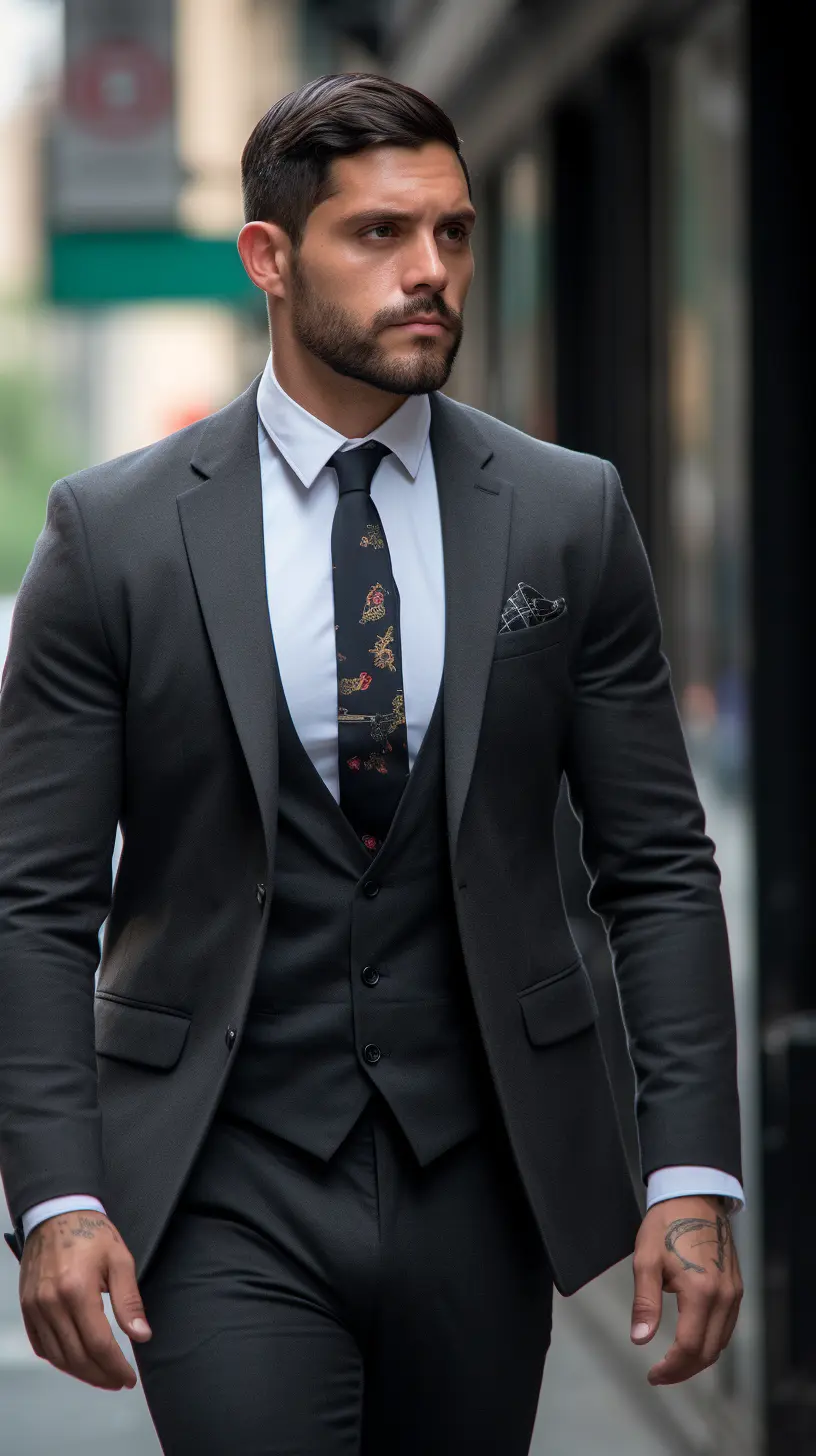 attractive handsome man, tall, manly face, strong chest, strong arms, trim beard, short black haircut style, serious neutral expression, suit, walking in new york