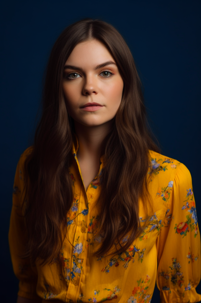 翻译:一个有点像卡伦-安妮-卡彭特的女人,长发,黄色和蓝色上衣,面对镜头,正面肖像,全身照片,时尚风格,红色背景 –ar 2:3 –v 5