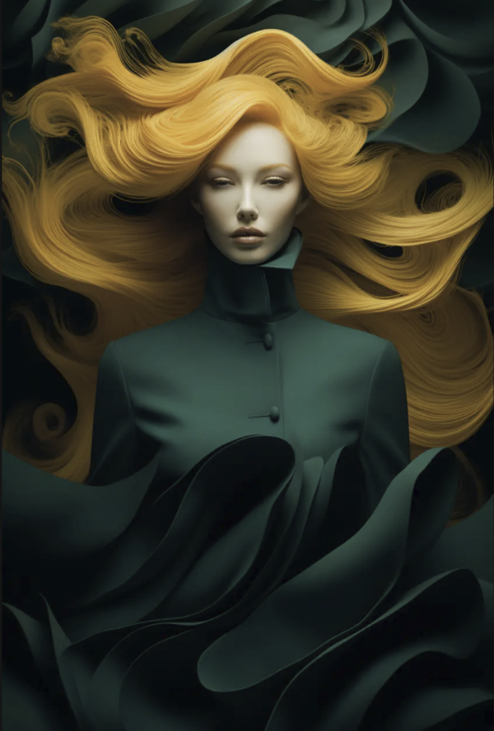 electron microscope photograph of a classy well dressed woman, abstract symmetrical surrealism, minimalist turbulent aurora waves, dramatic color tones amber, black, emerald, white, windy