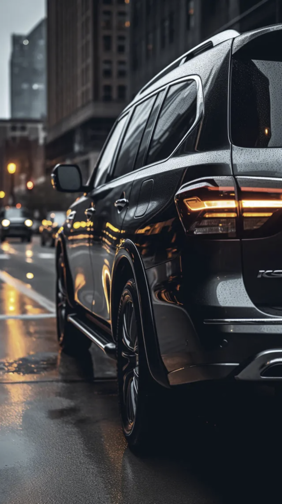photo straight from back, rear bumper of Infiniti QX80, intricate details, ultra highly realistic, majestic, ultra detailed, insane detail, real photograph, smooth light, photography, motion in the Chicago traffic, full HD, shot on a Sony DSLR, 50mm lens f/ 2. 8